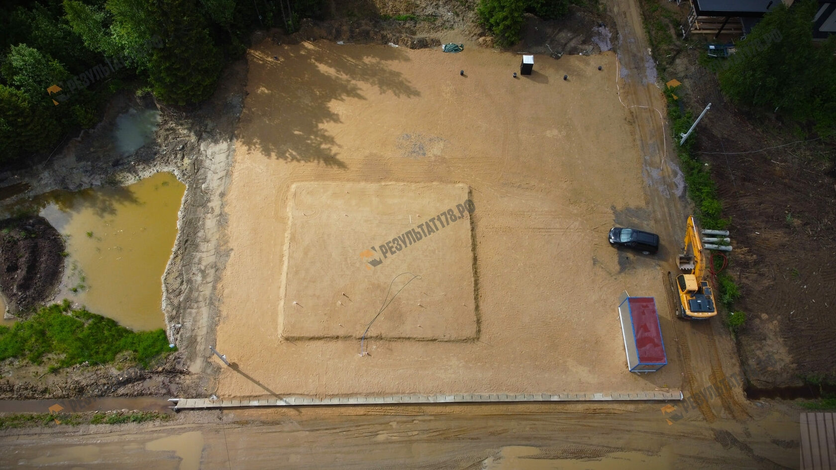 На этапе отсыпки задействовали бульдозер и экскаватор. Участок отсыпаем среднезернистым песком, с послойной проливкой и уплотнением всей площади поверхности. Всего завезли (V=1500 м2).